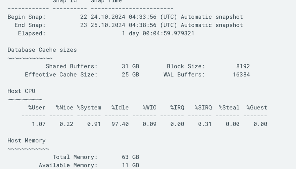 The performance snapshot report captures snapshots of your database’s performance metrics at any point during workload execution and generates reports based on any two snapshots. This gives you granular control over what periods you want to analyze, whether it’s the entire workload, specific intervals, or moments of peak activity. Each snapshot captures a wealth of information, including changes in key performance indicators like wait events, I/O statistics, and query execution times. It also captures system configuration details such as CPU usage, memory allocation, and parameter details.