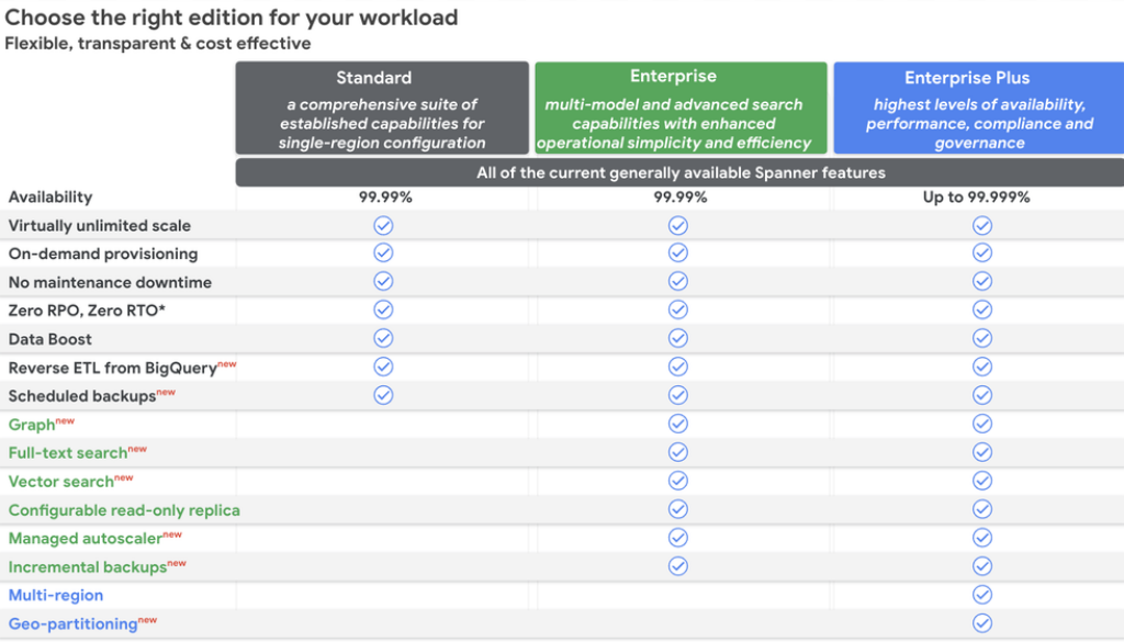 Standard edition is a comprehensive offering that includes all of the current capabilities that are generally available (GA) in single-region configurations, along with new features like scheduled backups and reverse ETL from BigQuery. Enterprise edition builds on the Standard edition by harnessing the power of multi-model capabilities including the new Spanner Graph, advanced full-text search and vector search. It also provides enhanced operational simplicity and data protection using managed autoscaling and incremental backups. For workloads that require the highest levels of availability, performance, compliance and governance, Enterprise Plus edition includes multi-region configurations with 99.999% availability and the new geo-partitioning functionality.