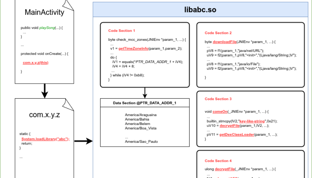 Using a tool like Ghidra, we decompiled the ARM64 ELF file into C source code and found that this app estimates the user’s geographic location using timezone information (“Code Section 1” in Figure 1). The code implements a loop that compares the user’s timezone with a list of target regions (“Data Section” in Figure 1).