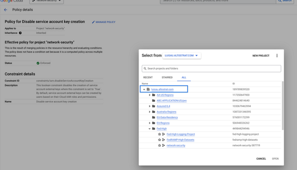 Before proceeding, ensure that you are logged in to the correct Google account. If you want to enforce this constraint across the entire Organization, be sure to select the Organization in the Resource Manager explorer: