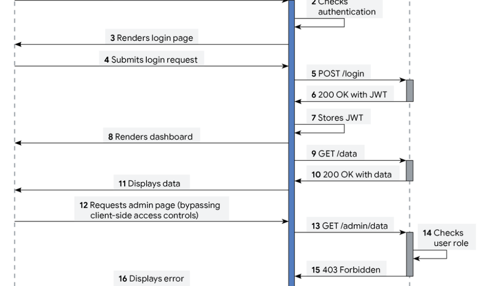 At the same time, the SPA requests the data necessary to render the page from the API. The API sends the data back to the application, and it is displayed to the user. Next, the user finds a way to bypass the client-side access controls and requests the main admin page in the application. The SPA makes the API requests to render the data for the admin page. The backend server checks the user’s role level, but since the user is not an admin user, the server returns a 403 error stating that the user is not allowed to access the data.