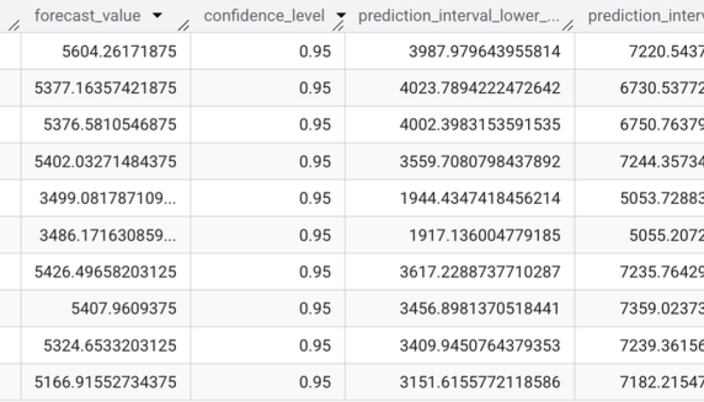 The output includes the forecast timestamp and values through the columns forecast_timestamp and forecast_value. The confidence_level is default as 0.95. The prediction_interval_lower_bound and prediction_interval_upper_bound show the bounds for each forecasted point.
